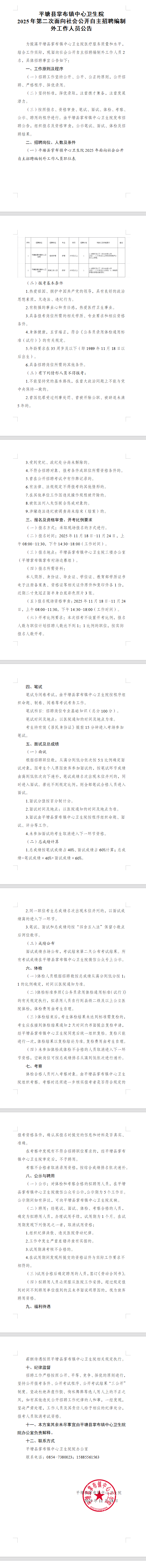 平塘縣掌布鎮(zhèn)中心衛(wèi)生院2025年第二次自主招聘編制外工作人員公告(11月18-24日報名)