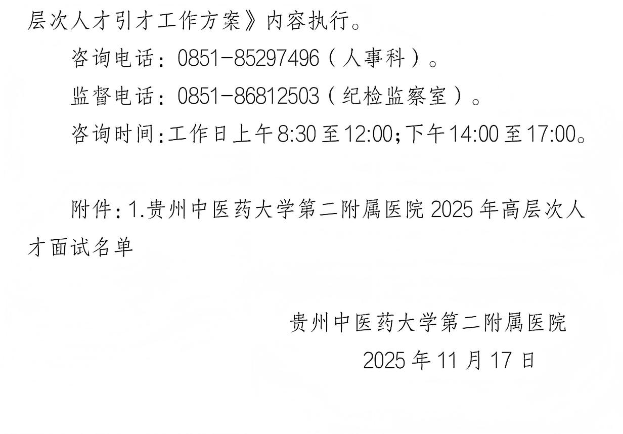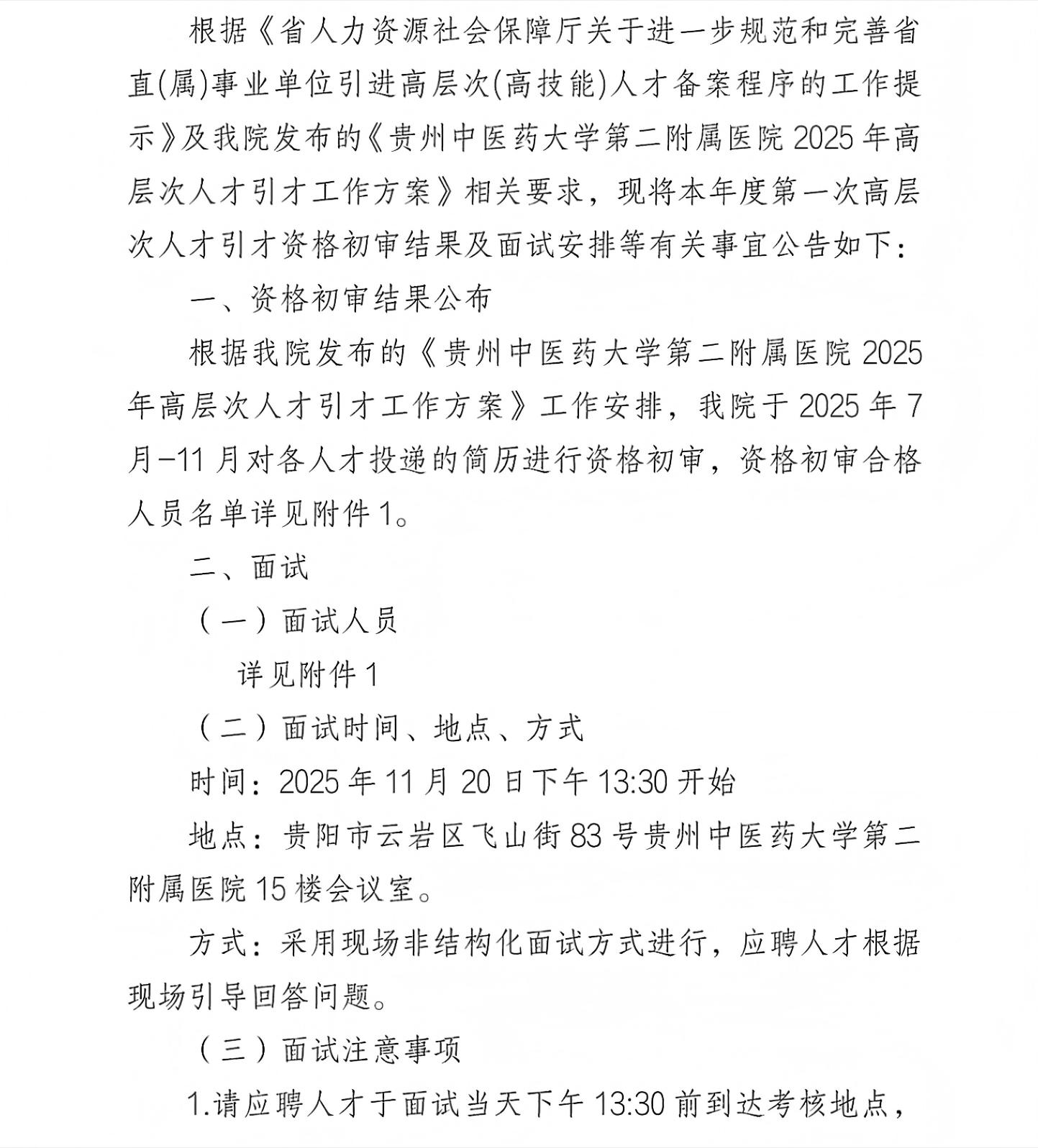 貴州中醫(yī)藥大學(xué)第二附屬醫(yī)院關(guān)于開展2025年第二次高層次人才面試等有關(guān)事宜的公告